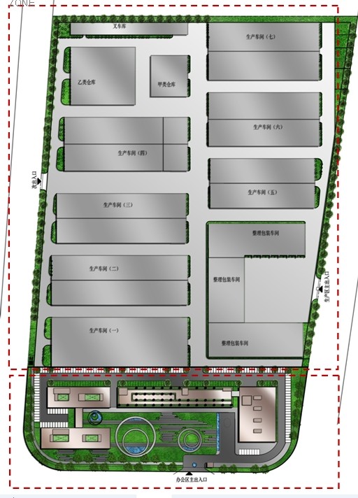 园区总占地220亩,总建筑面积16万㎡,包括甲类危险品仓,乙类危险品仓,六栋10米高单层厂房,一栋18米高单层厂房,一栋双层叉车库,一栋5层整理包装车间,一栋19层主体办公楼,一栋6层综合办公楼(首层是餐厅和招商中心),一栋6层宿舍楼和配电房等。